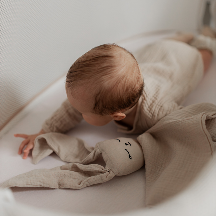 Mušelínová hračka vytvorená s ohľadom na prvé mesiace života vášho bábätka. Keď ju vopred pritúli mama, prevezme jej vôňu a dodá bábätku pocit bezpečia a blízkosti – aj keď spí oddelene!
